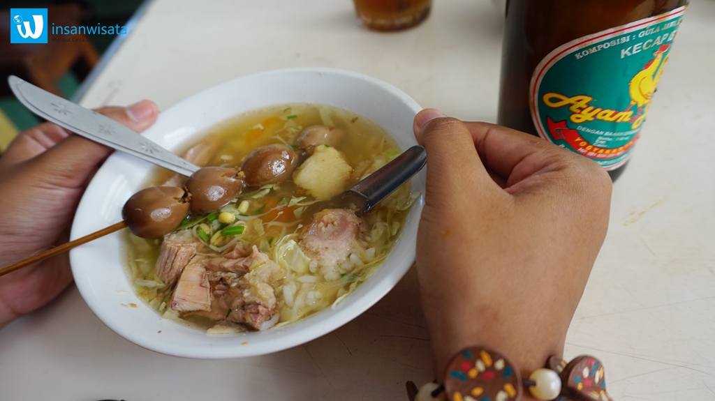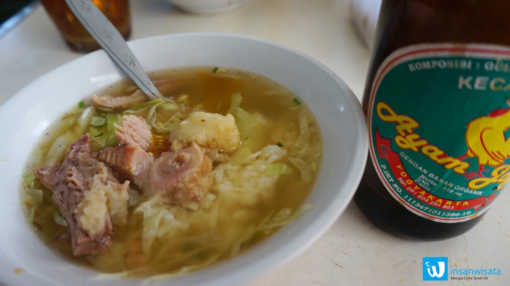 Lokasinya berada di Jalan Mayor Jenderal S. Parman Nomor 44, Tamansari, Yogyakarta. Kabarnya, soto ini yang paling melegenda di Yogyakarta. Benar saja, kami yang datang jam 8 pagi pun hampir tak kebagian tempat duduk. Bangunan warung di sisi jembatan ini pun telah tertutup mobil dan motor yang parkir berjejer. Soto daging sapi ini tak jauh berbeda dengan soto lainnya. Namun, yang membuat cita rasanya dirindukan orang-orang–termasuk kami–berasal dari kecapnya. Kecap Ayam Jago namanya. Botolnya unik, seunik namanya. Semangkuk soto harganya sekitar Rp10.000,00. Semakin nikmat disantap dengan iso dan babat yang dibeli terpisah.