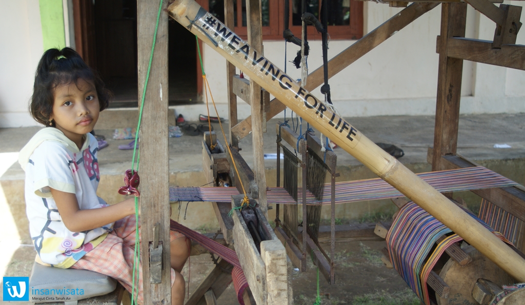 Seorang anak perempuan berlari-lari kecil menuju halaman rumahnya. Satu set lengkap peralatan tenun ditaruh di sana. Benang warna-warni tersusun rapi pada kotak-kotak bambu, membentuk pola kain yang belum selesai digarap. Anak perempuan itu duduk di kursi menghadap alat tenun. Sebelumnya ia utarakan keinginan untuk menenun pada ibunya yang mengiyakan. Aku yang kebetulan sedang berada di sana untuk mengabadikan gambar lantas serius mengamati. Tangan dan kaki gadis kecil—yang tak sempat kutanya namanya, namun kutaksir umurnya sepuluh tahunan—nampak cukup mahir mengoperasikan alat tenun. Tak heran, desa ini memang punya potensi pengrajin tenun yang masih mengeksiskan diri hingga kini.